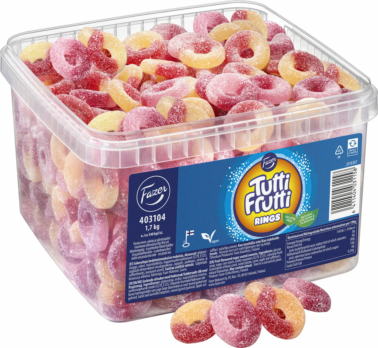 Ingredienser: glukossirap, socker, majsstärkelse/stivelse, surhetsreglerande medel (E270, E325), färgande livsmedel/fødevarer der farver/næringsmidler som avgir farge (koncentrat av svart morot/gulrot/sort gulerod, batat/sød kartoffel/søtpotet, morot/gulrot/gulerod, äpple och safflor), naturliga aromer. KAN INNEHÅLLA VETE/ KAN INDEHOLDE HVEDE.