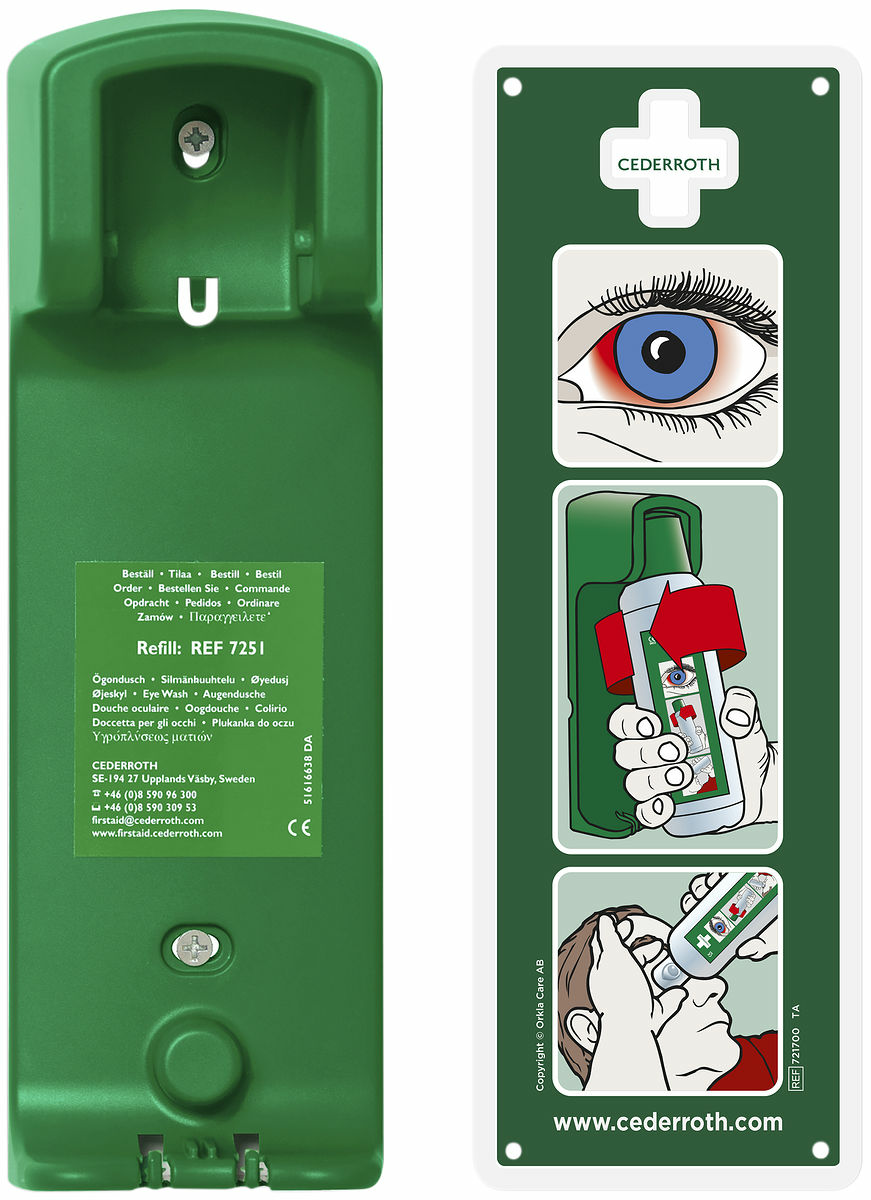 Robust och praktisk vägghållare för Cederroth Ögondusch 500 ml. Med vägghållaren får flaskan en bestämd plats så att alla vet var den finns. Flaskan sitter fastlåst i vägghållaren och öppnas automatiskt när den vrids ur hållaren – ögonsköljning kan påbörjas omedelbart. Efterlysande instruktionsskylt medföljer.