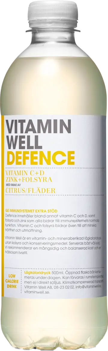 Vitamin Well Defence innehåller bland annat vitamin C, D, B12 och zink som bidrar till immunsystemets funktion. Dessutom innehåller den extrakt från fläderbär och grönt te.