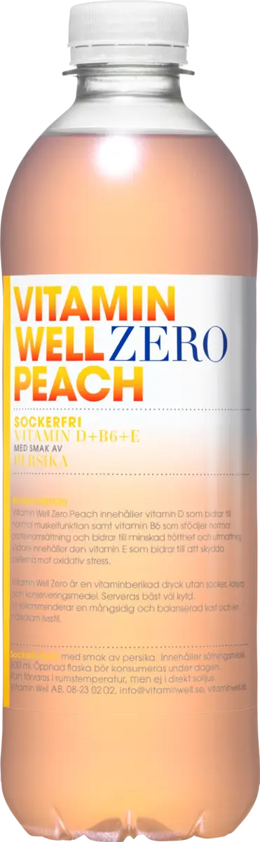 Vitamin Well Zero Peach bjuder på söt och saftig persikosmak samtidigt som den ger energi med vitamin D, E och B6. Vitamin D stödjer normal muskelfunktion, B6 minskar trötthet och E skyddar cellerna från oxidativ stress. Perfekt för en pigg och fräsch känsla hela dagen!